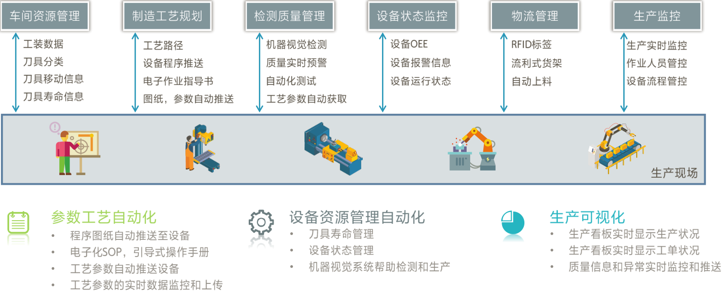 生產(chǎn):數(shù)據(jù)自動(dòng)收集,實(shí)現(xiàn)無(wú)紙化,減少錄入錯(cuò)誤,生產(chǎn)強(qiáng)制流程管控,OEE,設(shè)備監(jiān)控,計(jì)劃排程